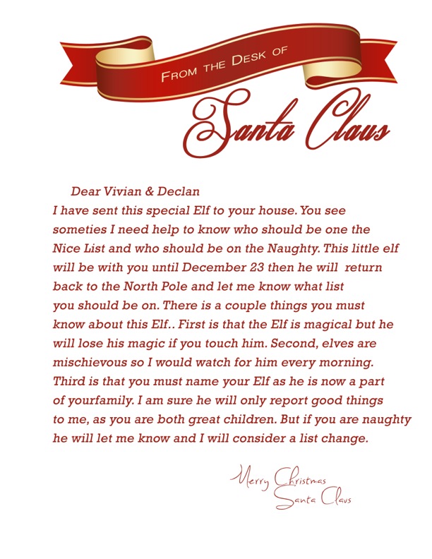 So this year I decided to do Elf on the Shelf, my daughter is 4 and I thought that she would enjoy it. Plus I thought that maybe it would hold her to some better behavior, no so so far. So last Sunday we are all home and I make some french toast for breakfast, we had a special guest at that table that morning… No one noticed him!!! I had to finally move him if front of my daughter (when she was away from the table of course) then she finally asked me “Mom is that from Santa?”