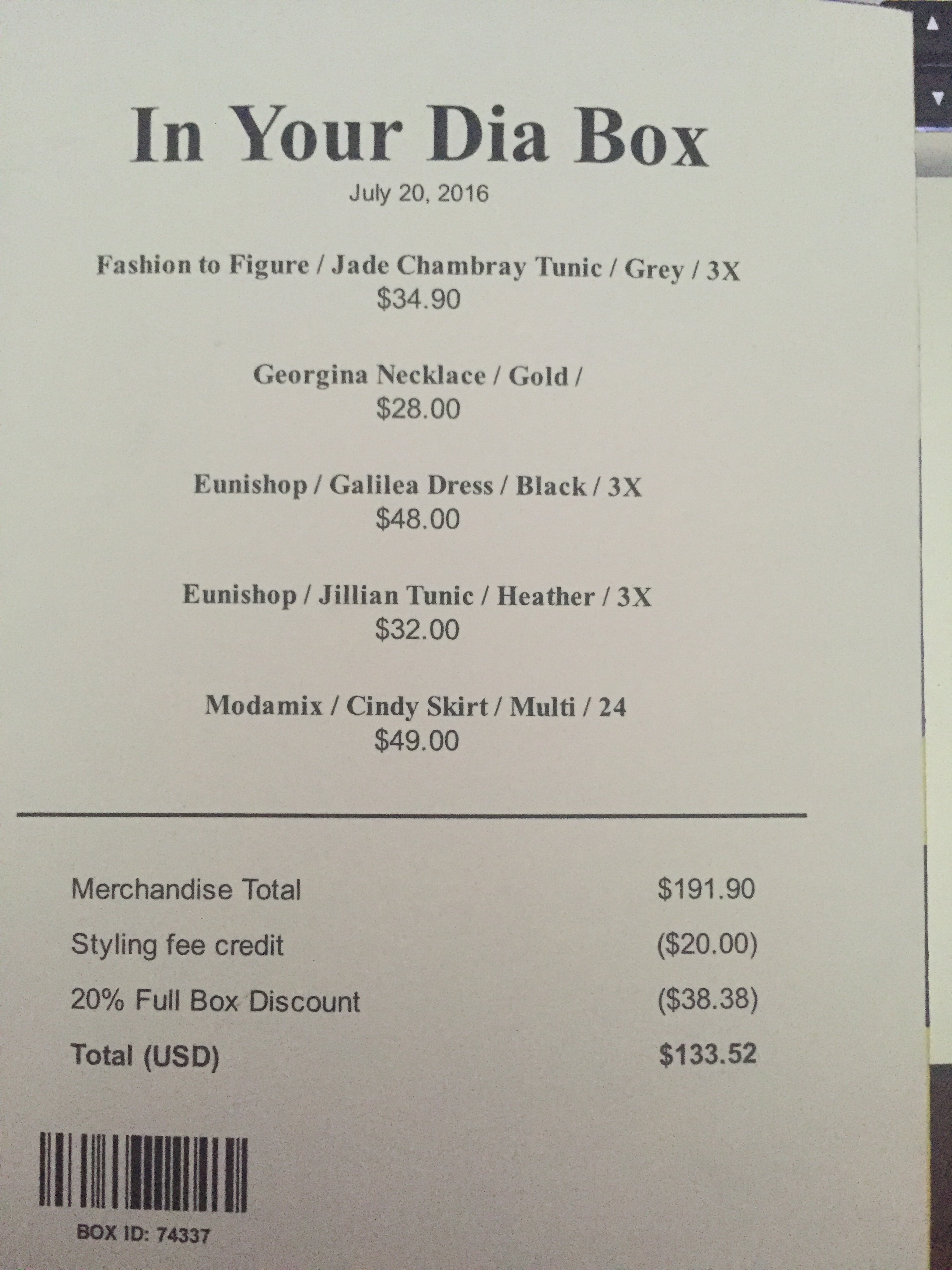 I’m sure most of you have hear of Stitch Fix, where you get a box in the mail with hand picked clothing just for you. Well I have always wanted to try it but they don’t carry big enough sizes 😦 The other week I was scrolling through Pinterest and I saw a Pin for Dia & Co and the caption read something like …plus sized fashion delivered to you…. So I gave their web site a look around, same deal as Stitch Fix just bigger sizes, size 14 and up, yes up not down!