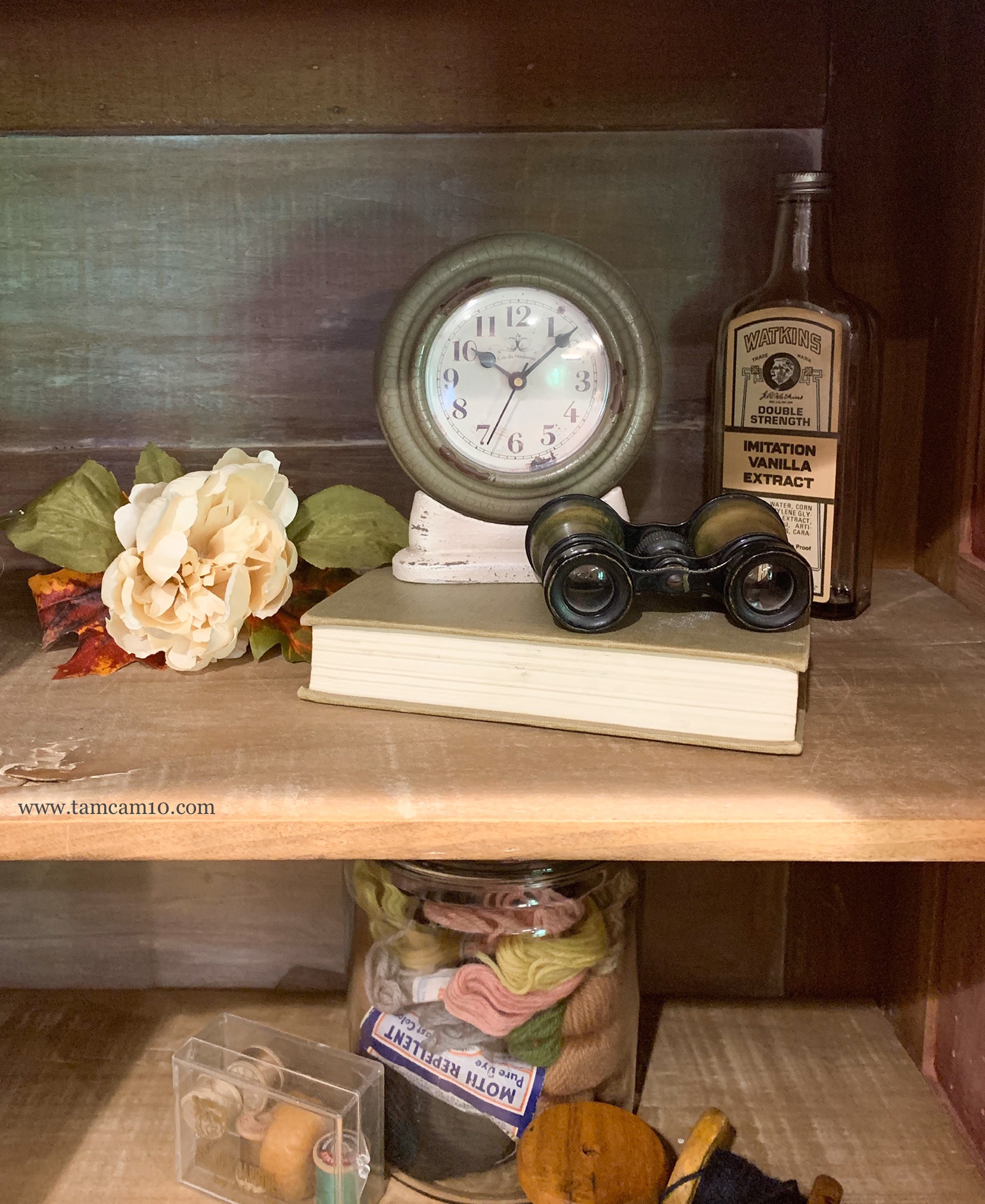 Since I am new to this whole decor thing my stock it limited, so I like to take items from other rooms and create new setups when I change things up. The vintage Thermos’ and Campfire Marshmallow tin I pulled from my Den/Dining room summer set up. Then I put together a few grouping of items I had around the house to create this sort of General Store feel.