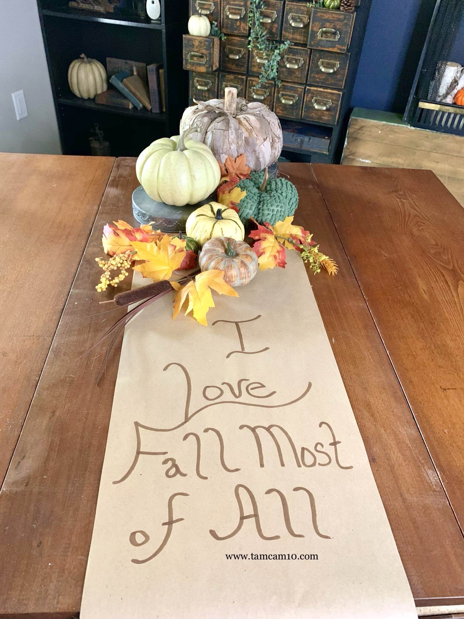 Every Dining Room needs a table, even though are is used mostly for decor. An array of pumpkins and some simple kraft paper complete this look. I tried my hand at some lettering on the paper but that needs some practice.