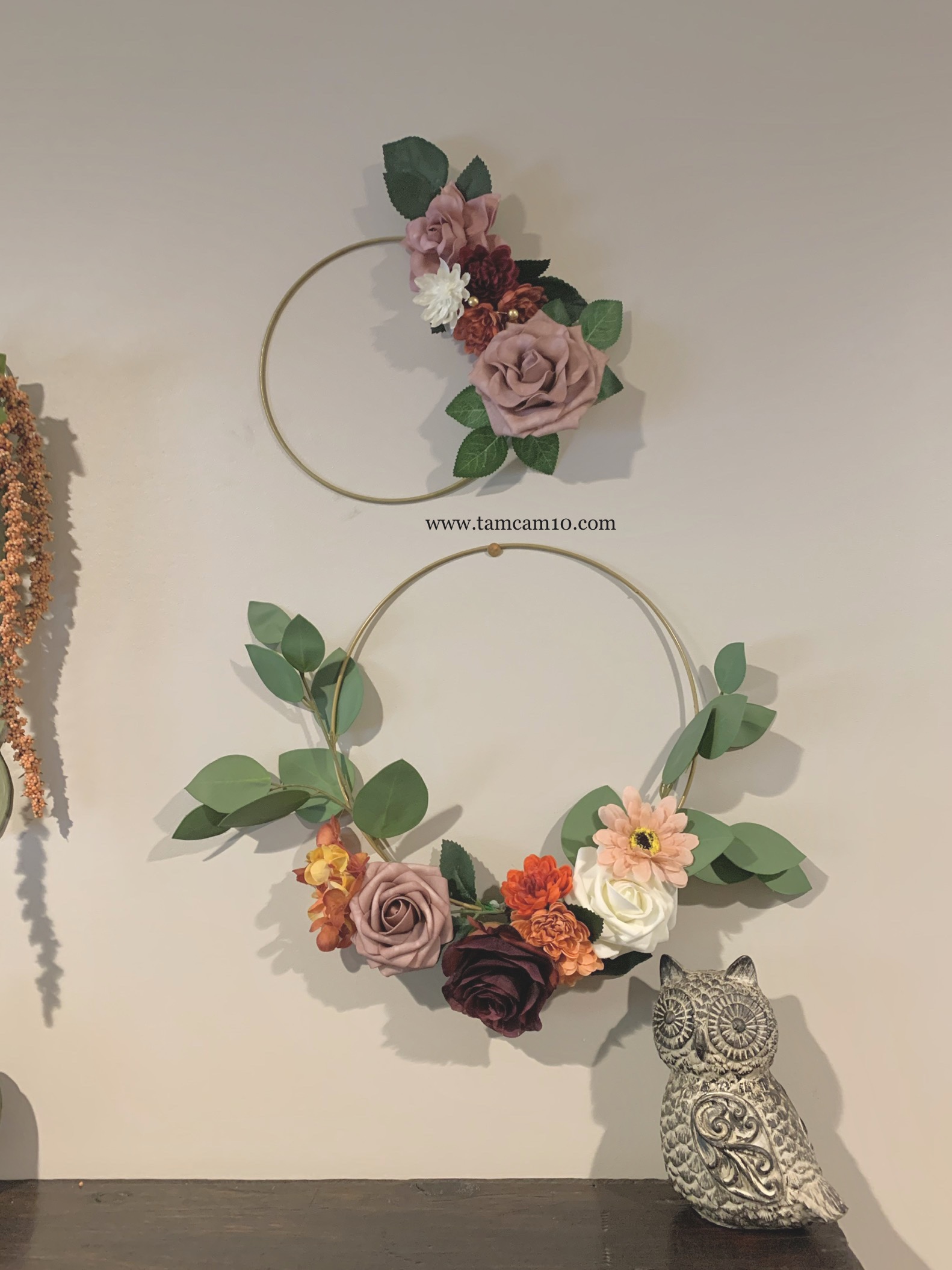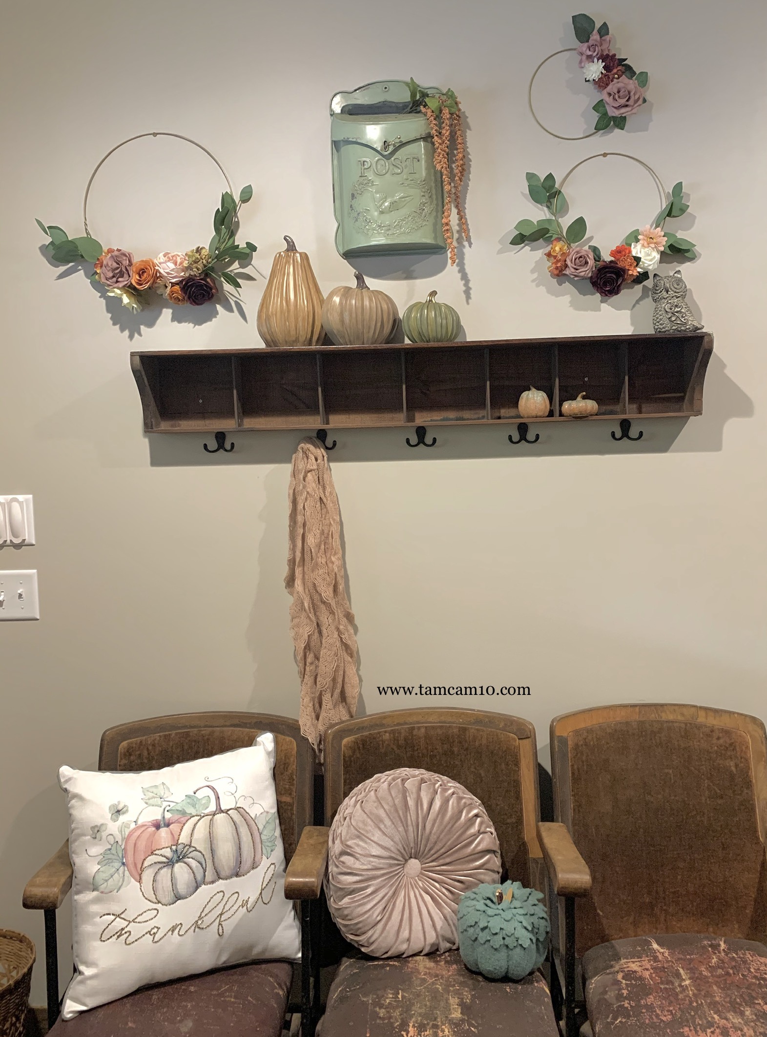 For the entry way I still have my gold hoops up on the wall. I have had them up since spring and have just been adding/taking away some flowers to go with the season or holiday. For fall I added in some deep purple and orange flowers.