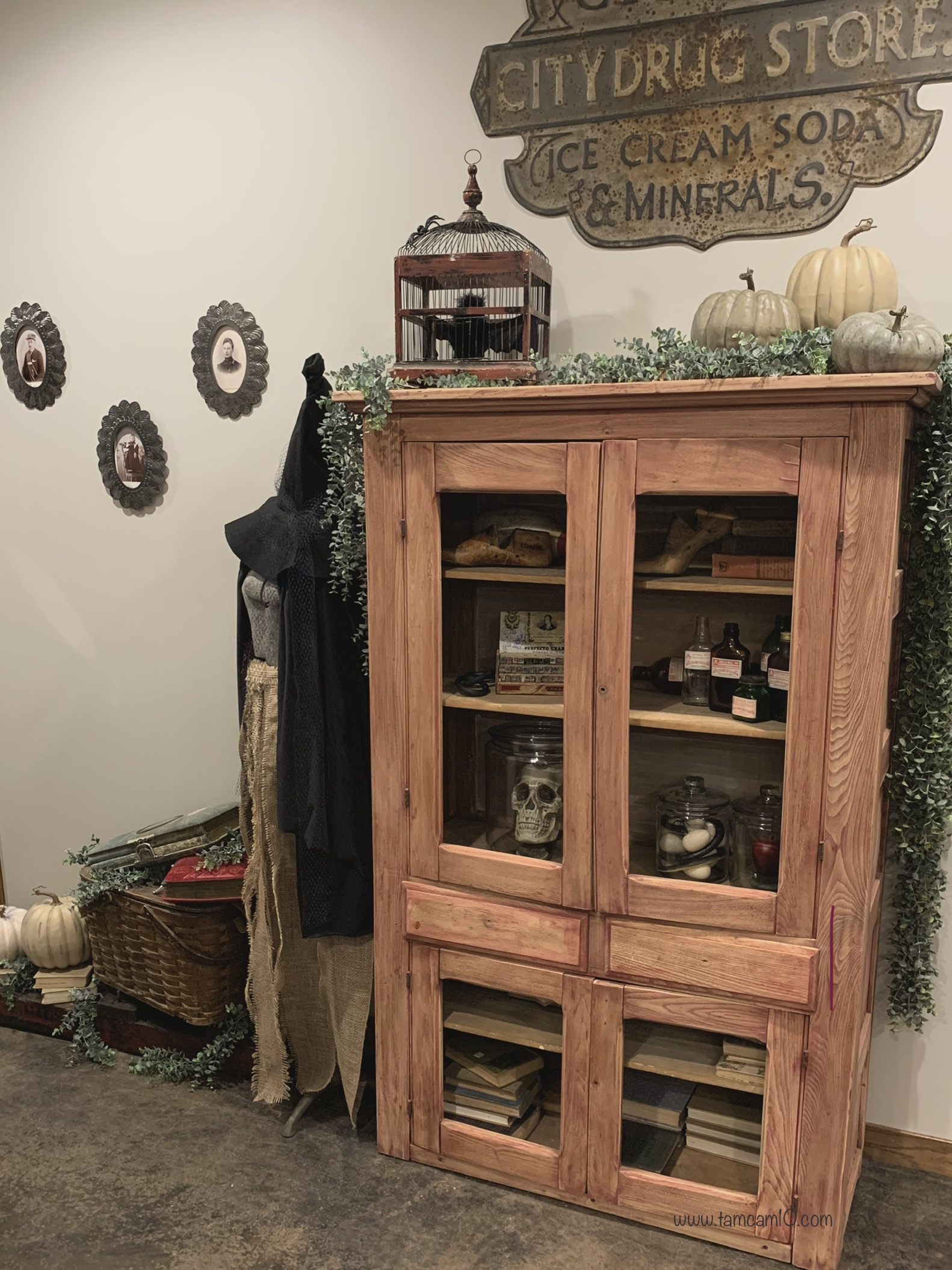 As long as I have started with a Halloween trend on this wall I might as well carry it along in my Antique Pie Hutch.